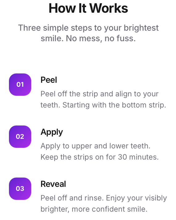 No Equipment Needed: Peel, apply, wait, remove. No LED device, no gels, no mouth trays. The simplest format for at-home whitening.