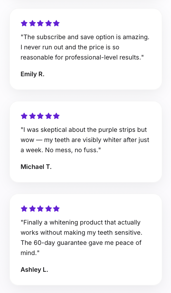 SmileLab's Purple Power Whitening Strips do two things at once. The purple colour-correcting formula uses colour theory to visually neutralise yellow tones on contact. Underneath, the PAP whitening ingredient gets to work on the surface stains that build up from coffee, wine, tea, and everything else. 30-60 minutes per session. No gels, no trays, no LED device needed.